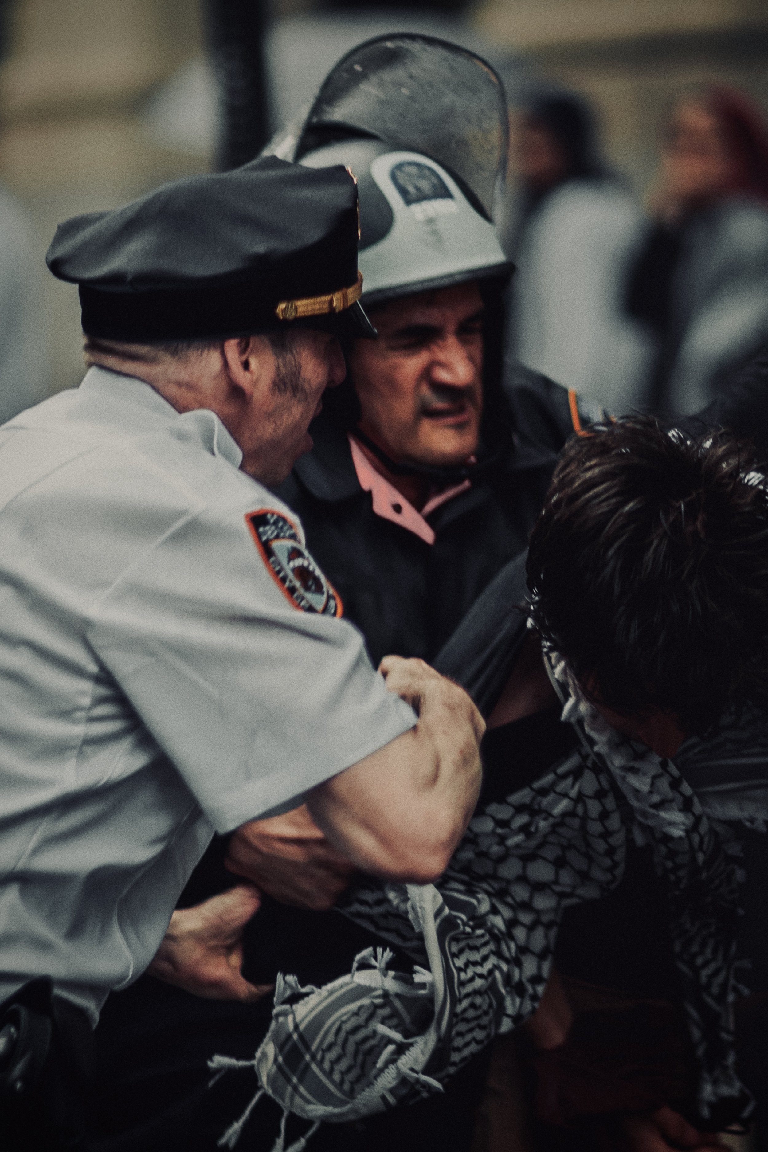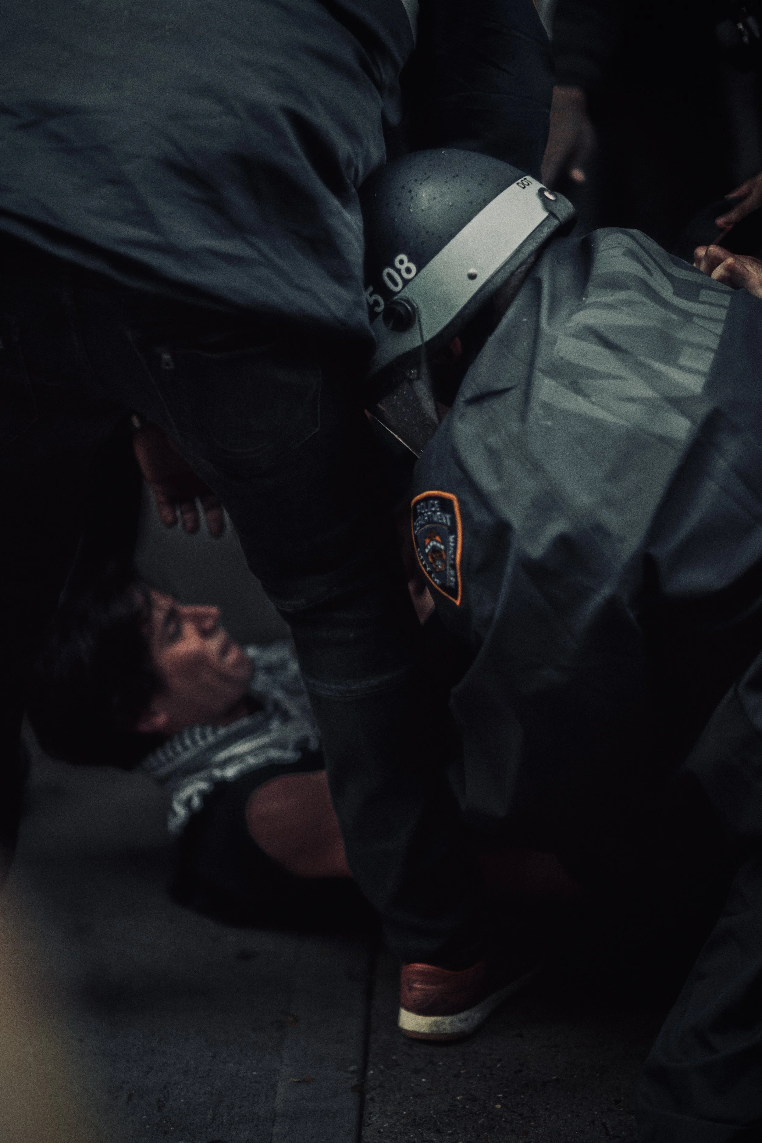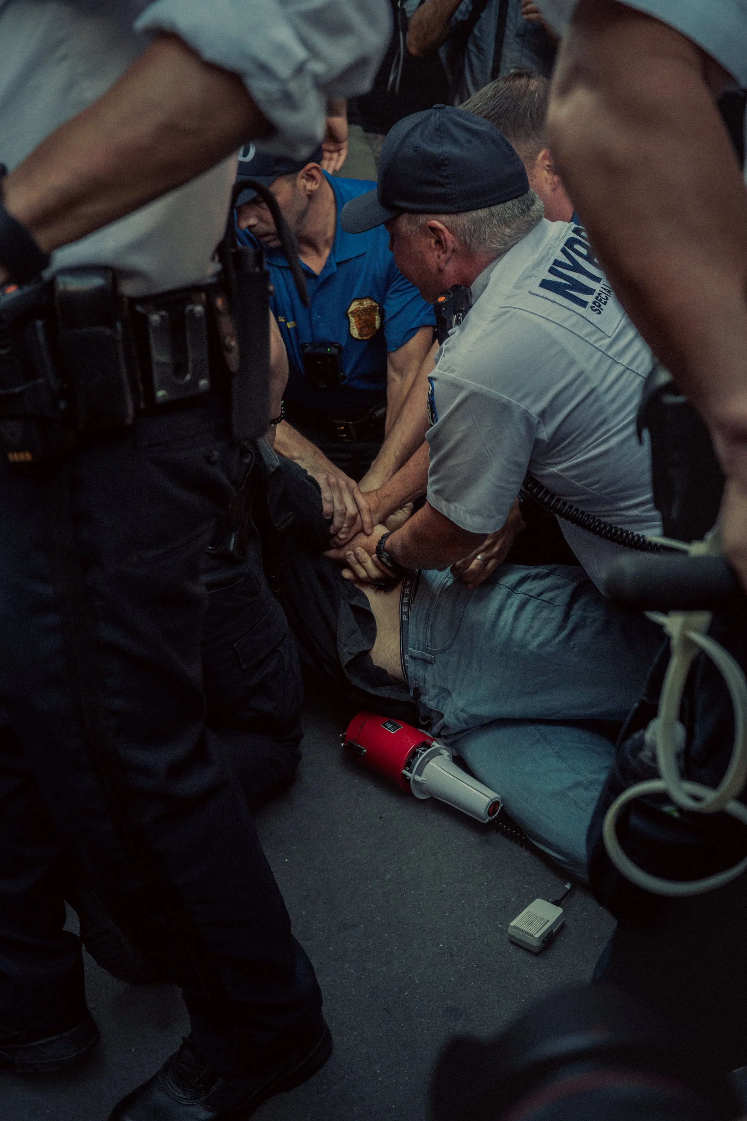 NYPD brutality assaulted protestors. Abdullah Akl suffered a broken arm due to police attacking and arresting him as he lead the protest that night. Others were seen bleeding or put in chokeholds.